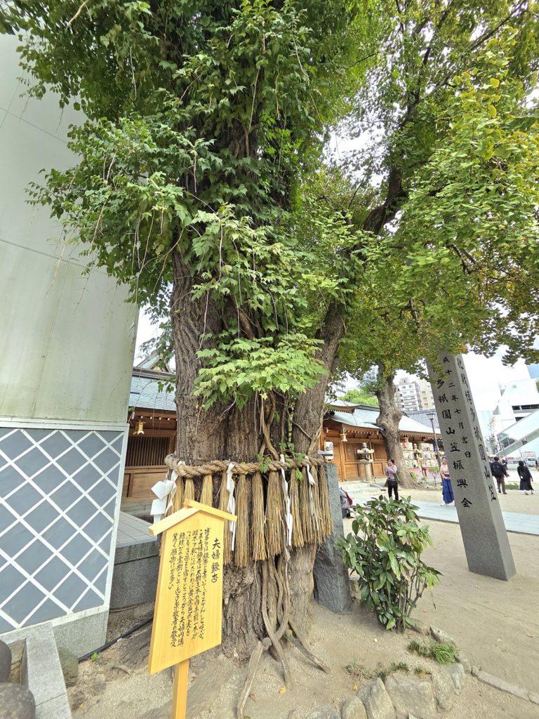 楼門を入った左側に櫛田の銀杏(ぎなん)がそびえています。