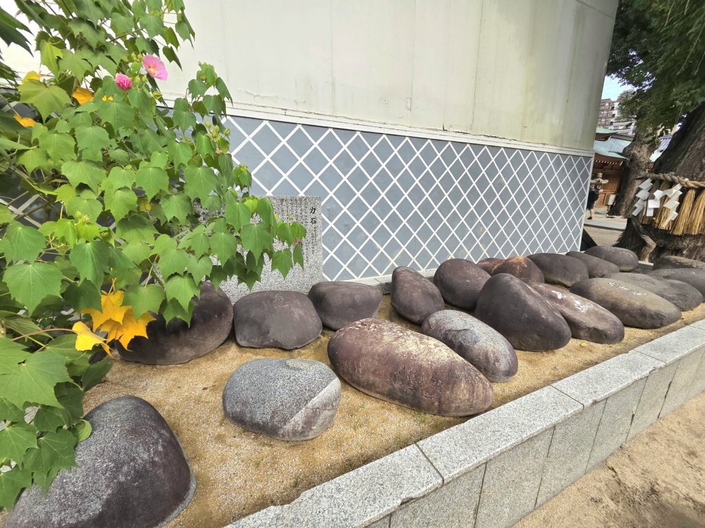 拝殿の左側にたくさん並んだ力石があります。