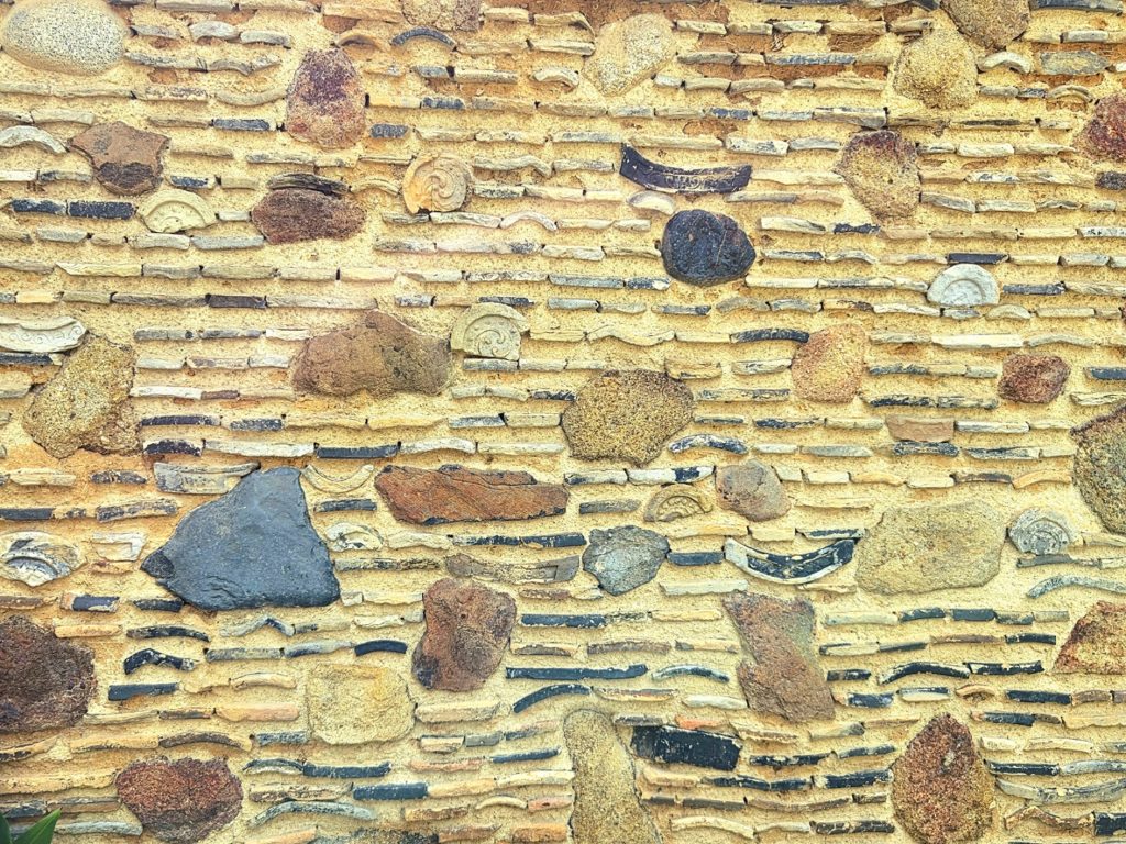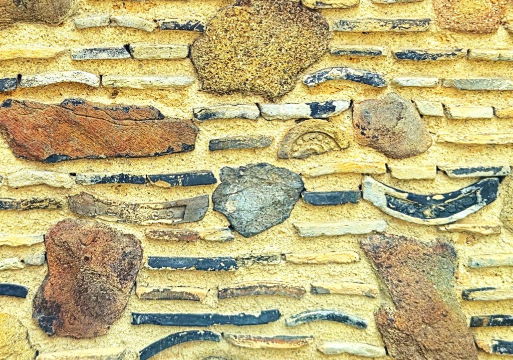 色や形の異なる陶器や石材がパッチワークのように埋め込まれています。
